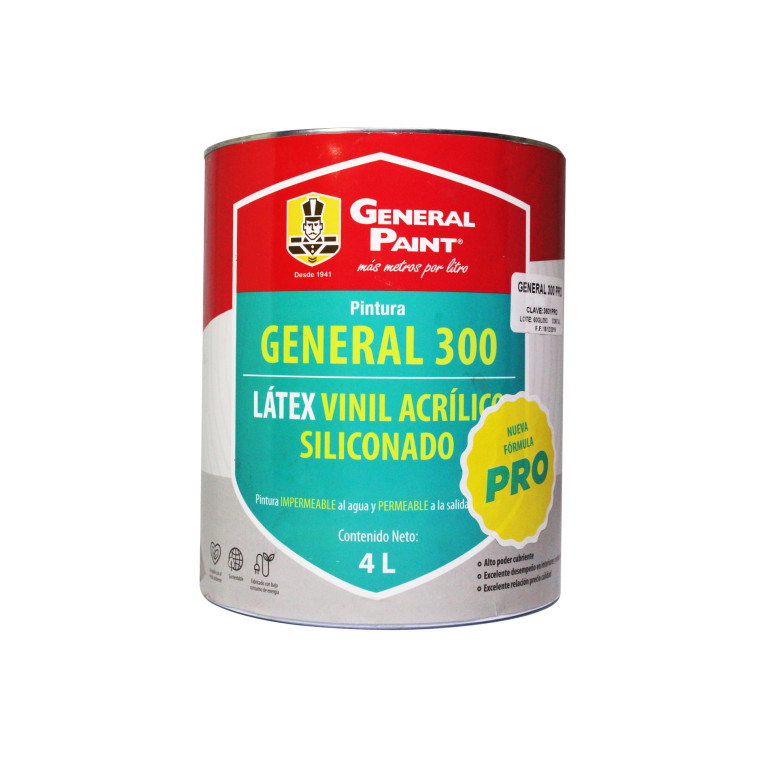 Galón De 4 Lts. Pintura Vinilica Modelo G-100 Color Blanco y De Línea Interior y Exterior, Durabilidad real 3 años Acabado Mate, Lavable, Rendimiento Teórico 12.1 M2/lt Marca General PaintMétodos de Pago